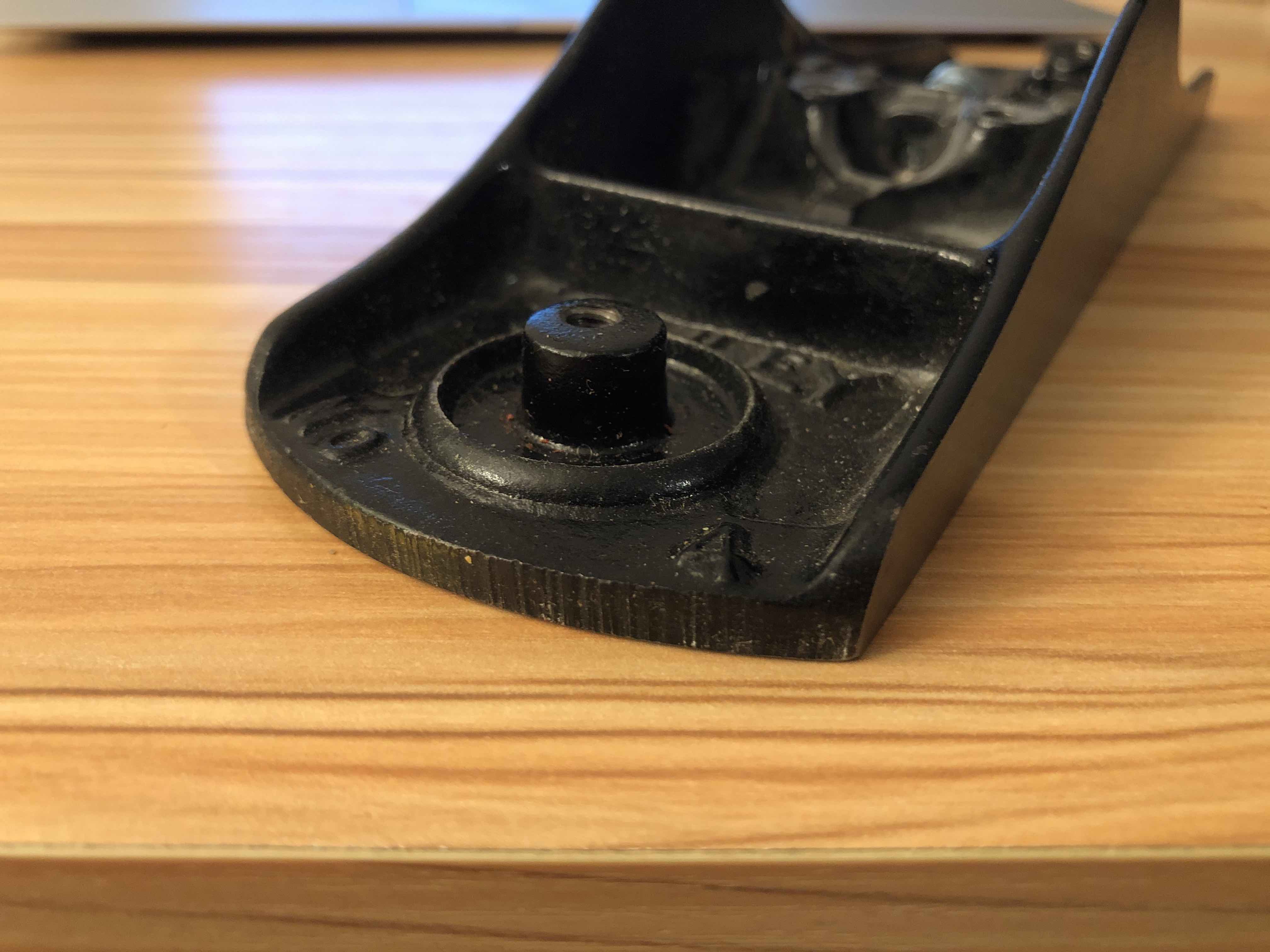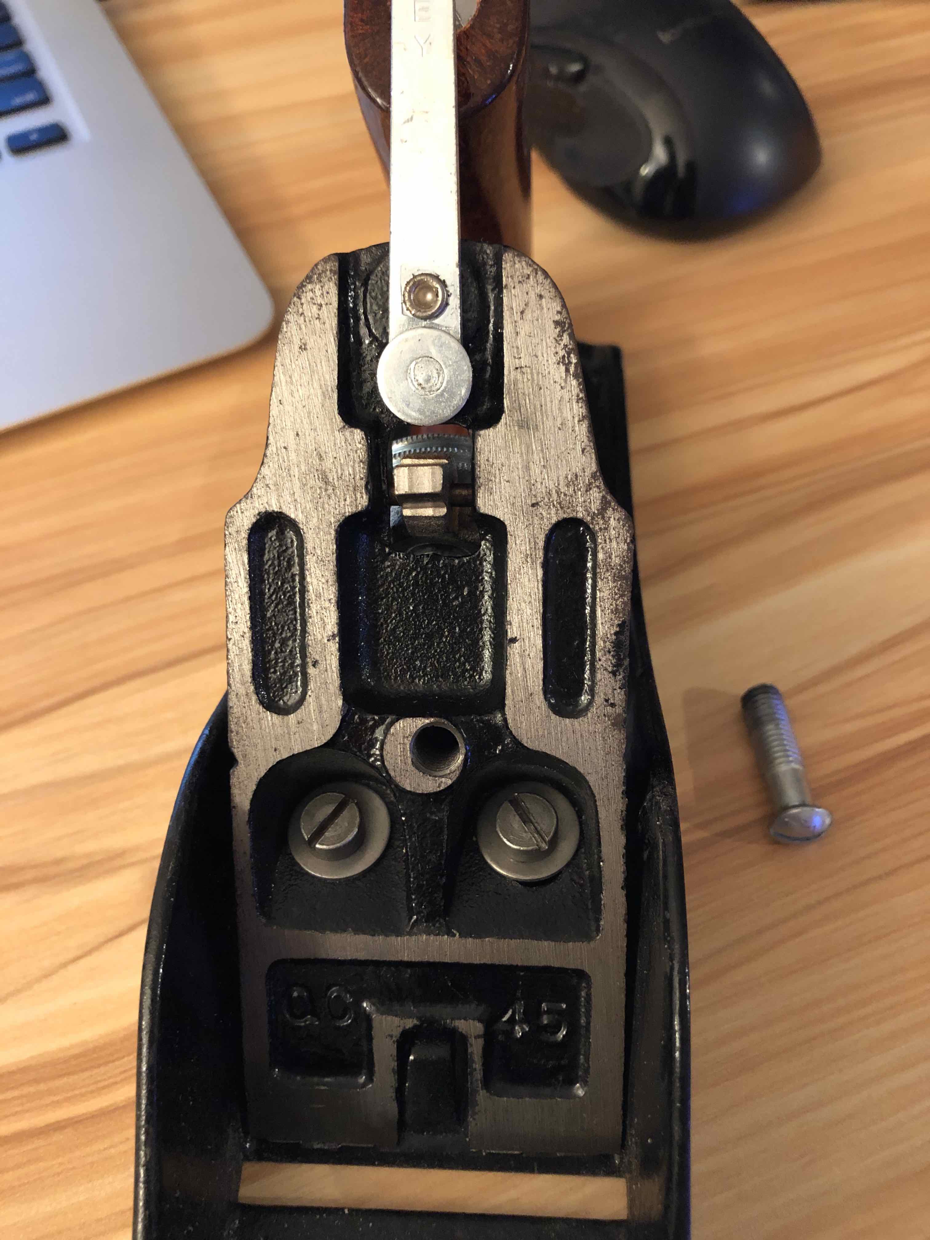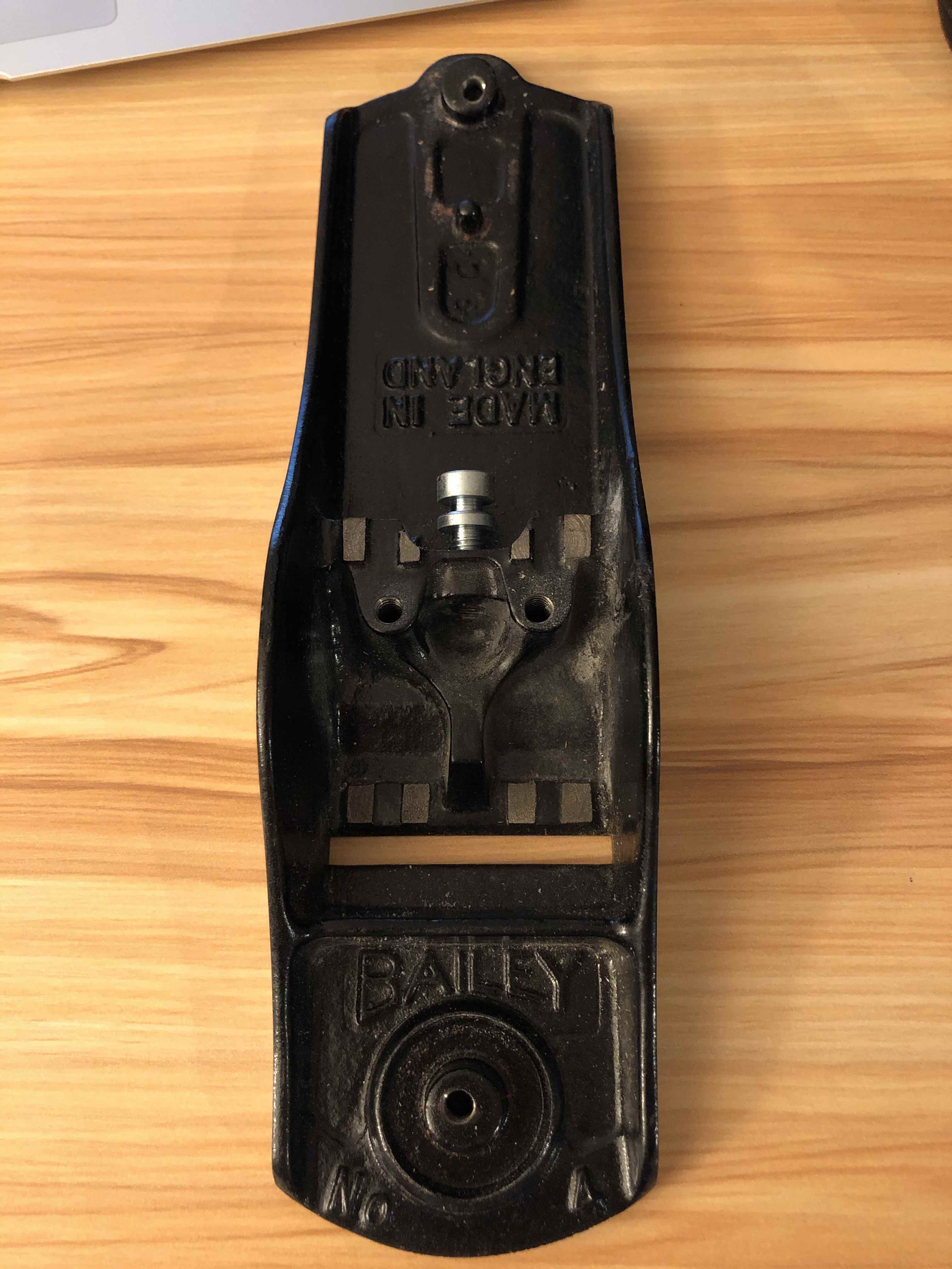 Frog contact points are much smaller compare to planes made before the 60s. The tapped holes for the knob rod and handle rod are off center.
